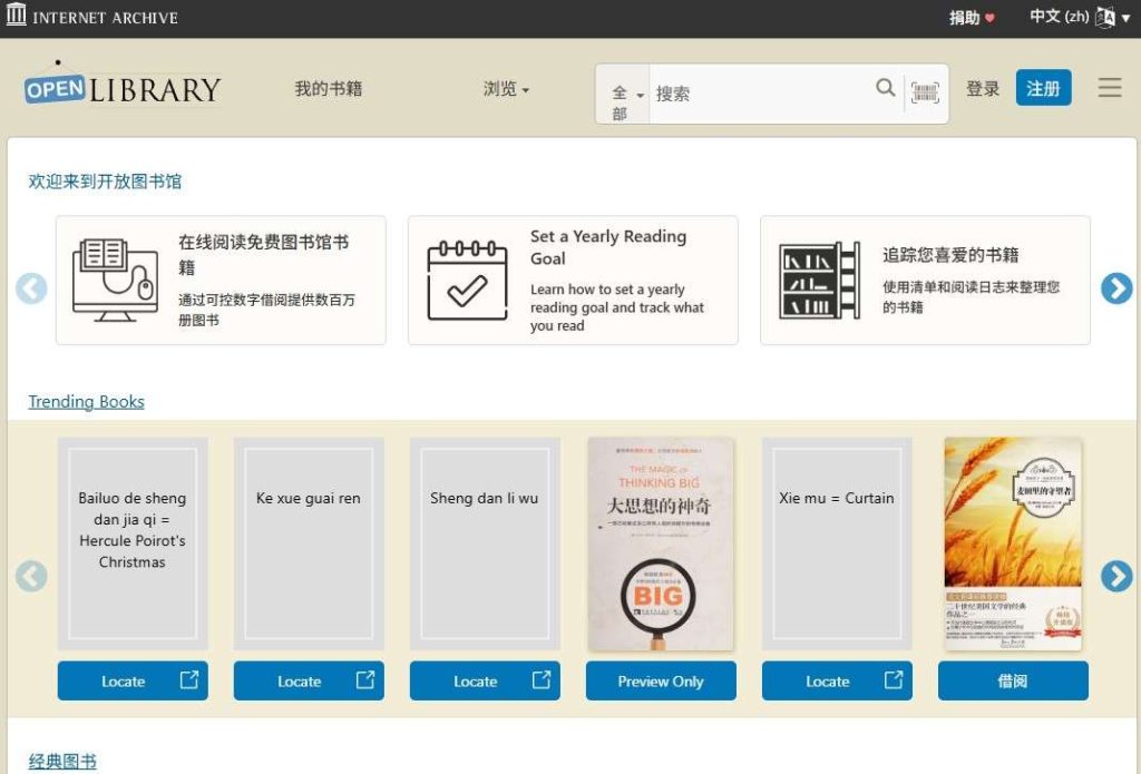 不仅提供电子书,还包含音频、视频、历史档案等。许多旧版图书可在线借阅。